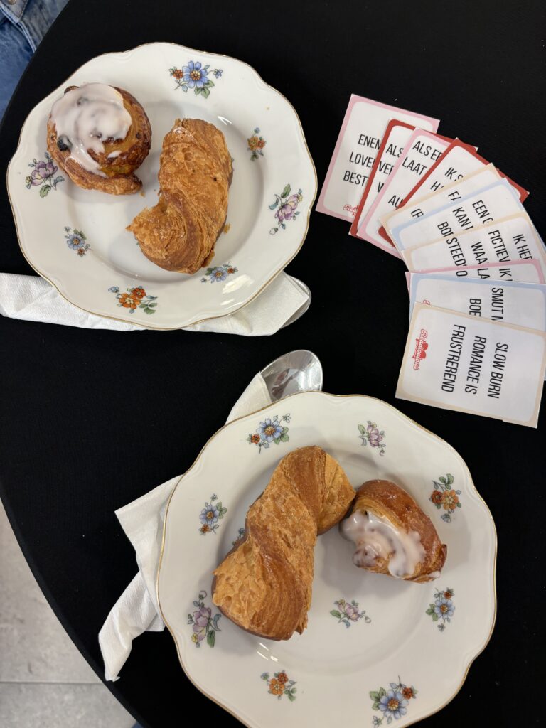 En alsof dat nog niet genoeg was, had Readiculous voor ons nog enkele leuke gratis corners. Zo was er een fotobooth waar je jouw dag op beeld kon vastleggen. Er was een creative corner met materiaal om zelf je fantasywereld op papier te zetten of je favoriete quote aan het prikbord te hangen. Je kon ook een book bingo spelen met leuke challenges om nieuwe boeken te ontdekken, terwijl je ook nieuwe mensen leerde kennen. Had je dan nog geen inspiratie voor een volgende boek? Dan was er ook nog de ‘Get inspired’-hoek om mee te praten over tropes, personages en verhalen. En was het voor jou even druk genoeg geweest of wou je even wegzinken in je boek? Dan waren er de silent reading corners met bijhorende noice cancelling koptelefoons.